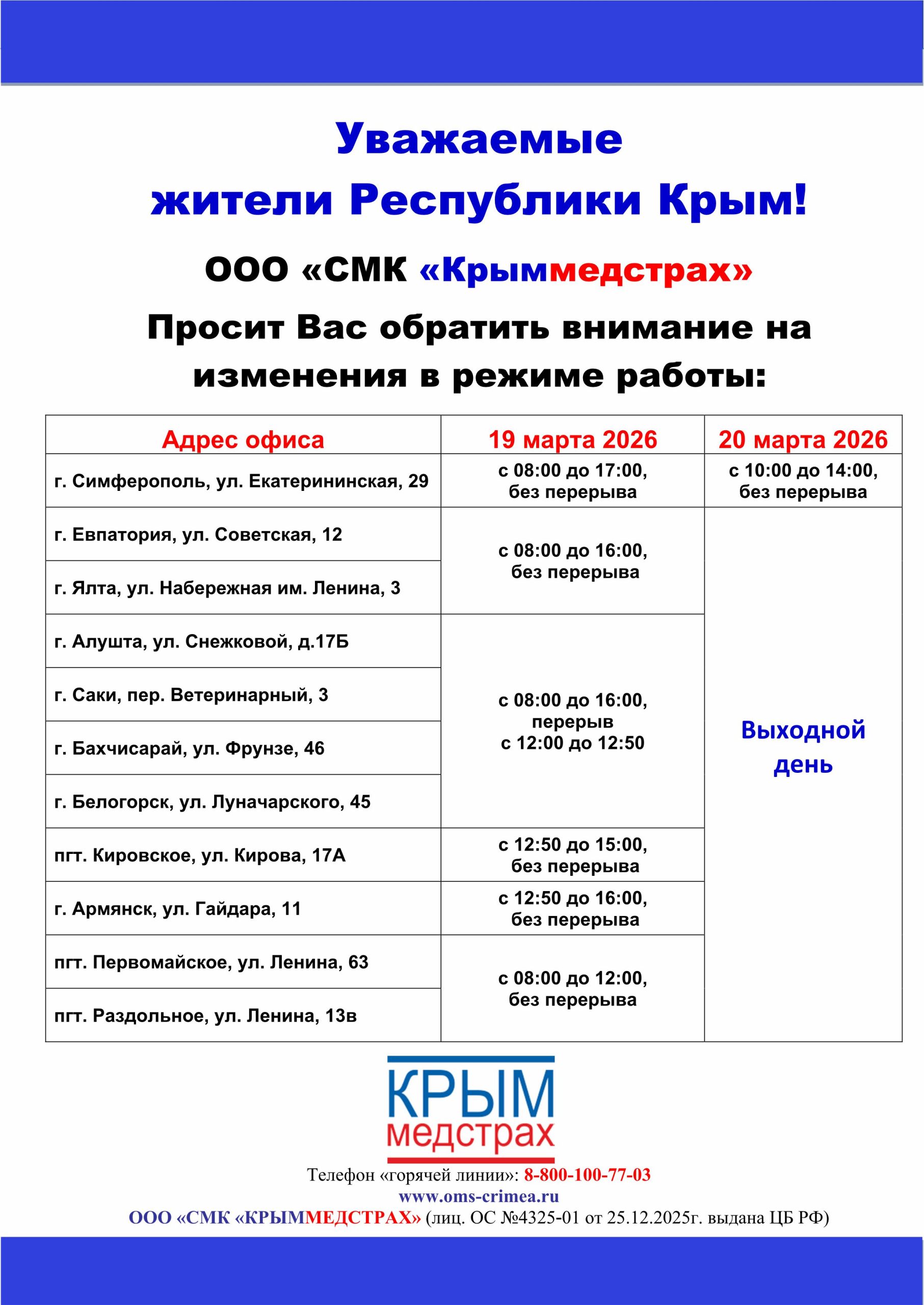 График работы постов и визитов страховых представителей ООО «СМК «Крыммедстрах» на апрель 2026 года »