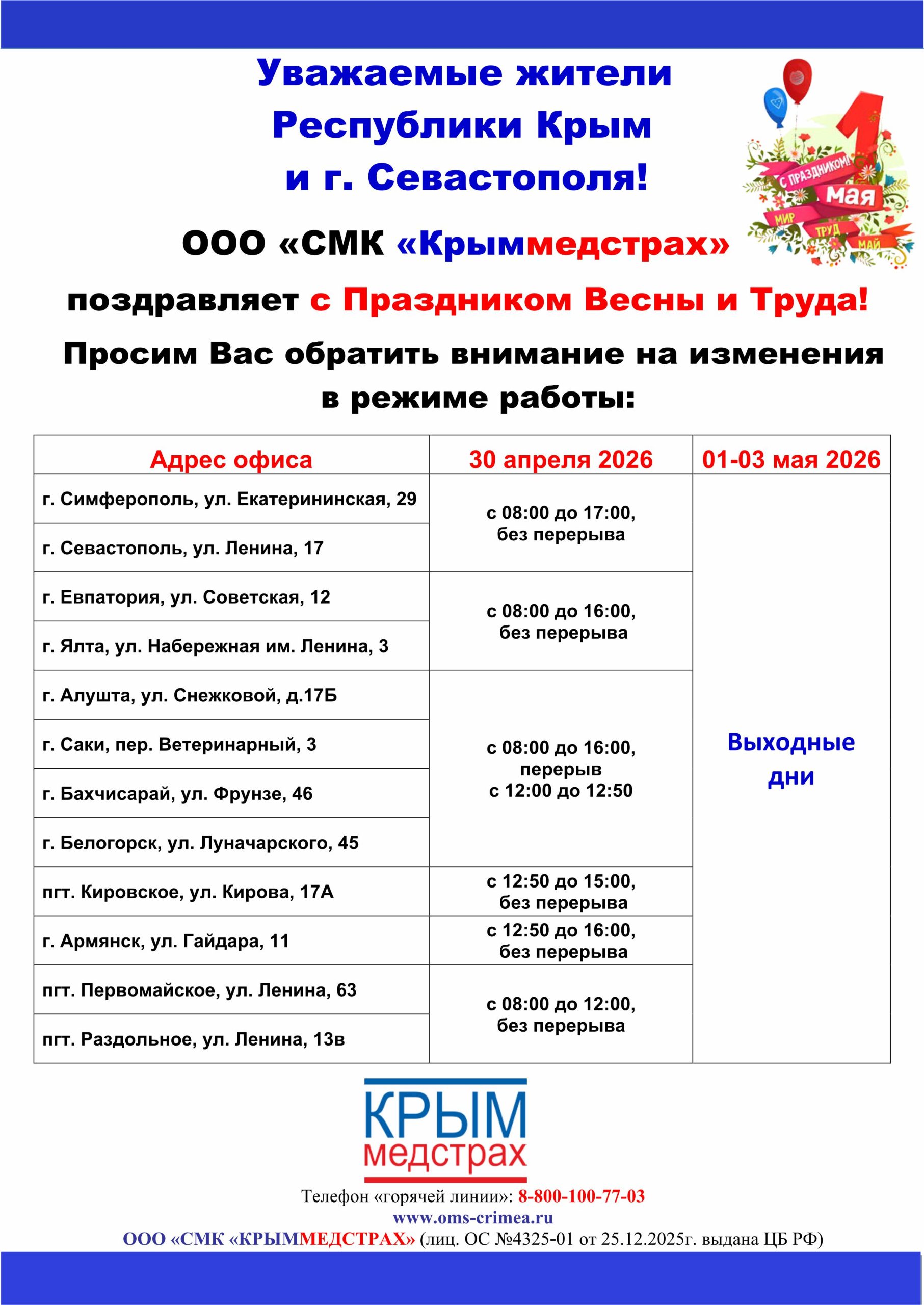 « График работы постов и визитов страховых представителей ООО «СМК «Крыммедстрах» на май 2026 год